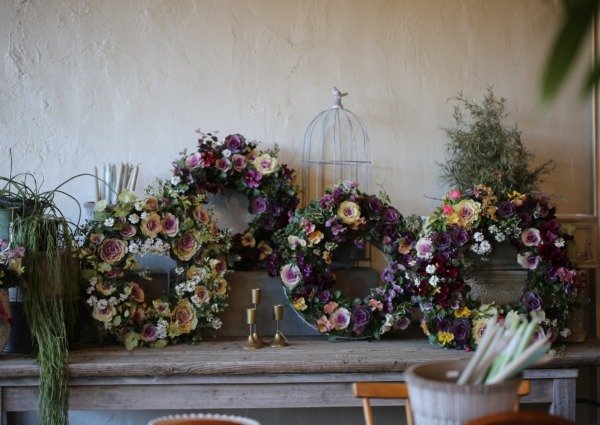 こちらは平日の部で作ったつながるリース。平日の部では壁掛けウォールバスケットも作りたい!ということで、一回り小さいリースで作ることになりました。ホワイト〜イエローが繋がりながら、なかなか使わないビビットなオレンジをいかに自然に入れ込むか、というなかなか難易度の高いリースになりました。リース台が小さいとまあるく作るのも難しいですね。「つながるリース」で、ギャザリングのパーツ感の固定概念を打ち破り、のびのびとした作品を作れるようになる、ポイントがわかりやすいレッスンでした。
