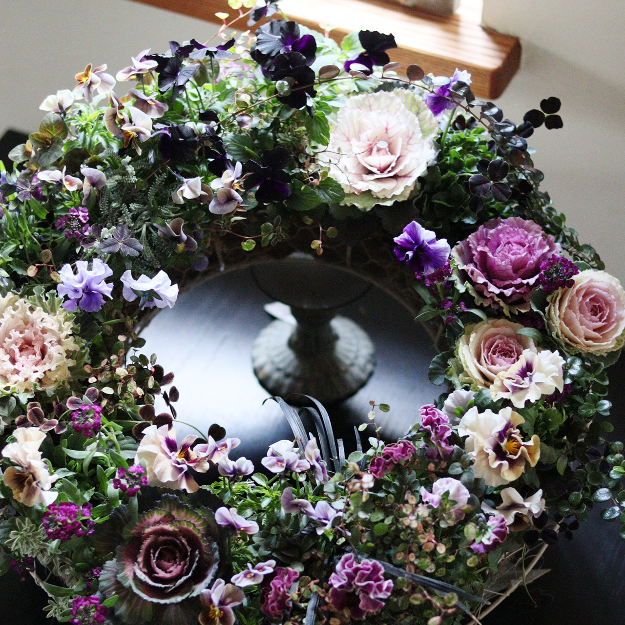 定番のハボタンにビオラをミックスし、自分好みのハボタンリースを作りましょう。