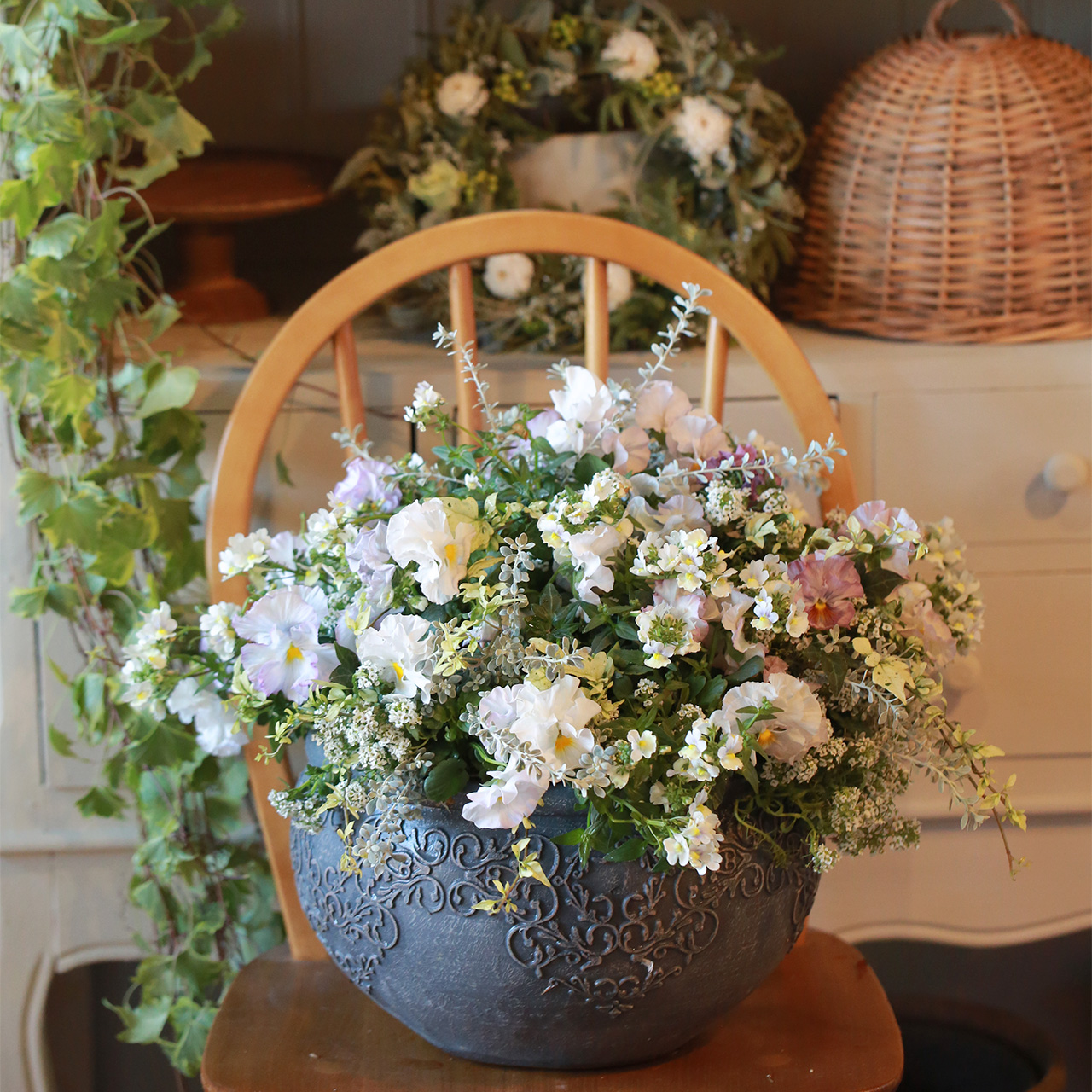 冬の草花を使って、作品を山のようにこん盛りと植え込むマウント植えを学びます。360度どの角度から見ても美しく仕立てるマウント植えはとても豪華で冬の寒い庭を華やかに彩ります。
