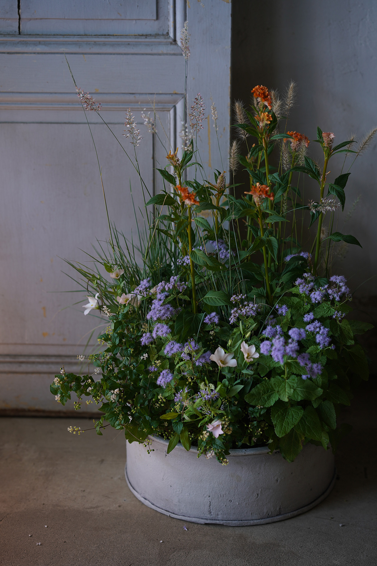 【華もみじオリジナルガーデンコフレポット】にシンビジュームとラックスをブリコラージュ