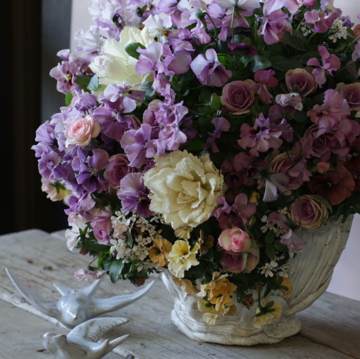 うっとりするほどのロマンチックなラベンダーカラー「多摩の舞」をメインに植え込んだウォールバスケット。バスケットはリユースの綱木紋を使用しました。