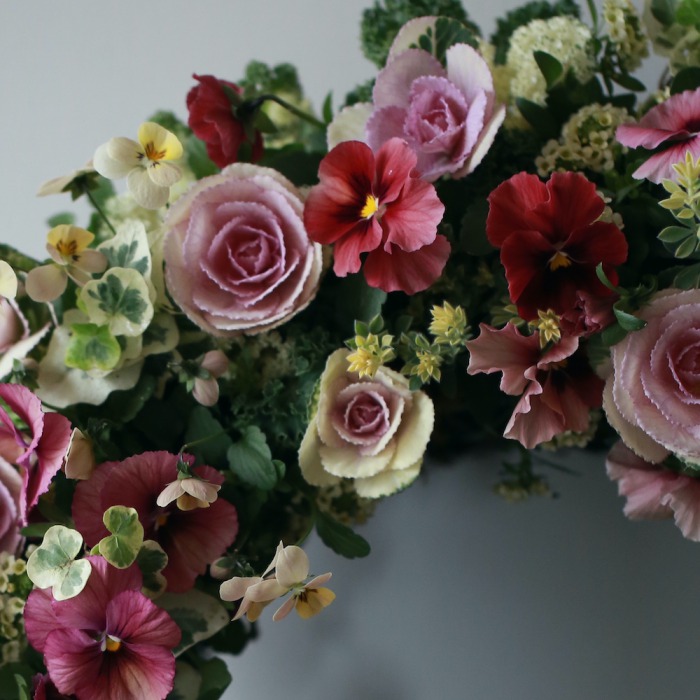 表現の違う中輪パンジーでそれぞれの個性を活かしたリースを作り比べてみるのはいかがでしょう?