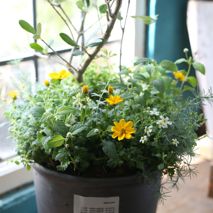 お庭や玄関先に飾ったら、ビデンスの黄色で元気が出そうですね。