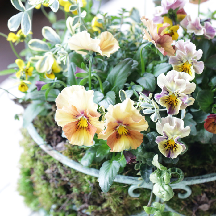 ビオラ多摩のもみじ、ミニバラ グリーンアイス、苔、他