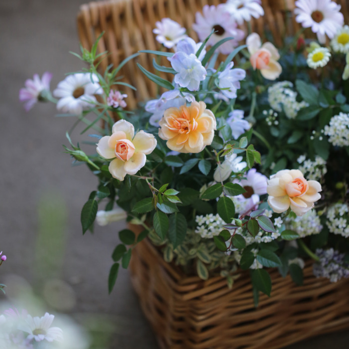 淡いシャーベットカラーの春花を横長TP3バスケットに植え込みました。