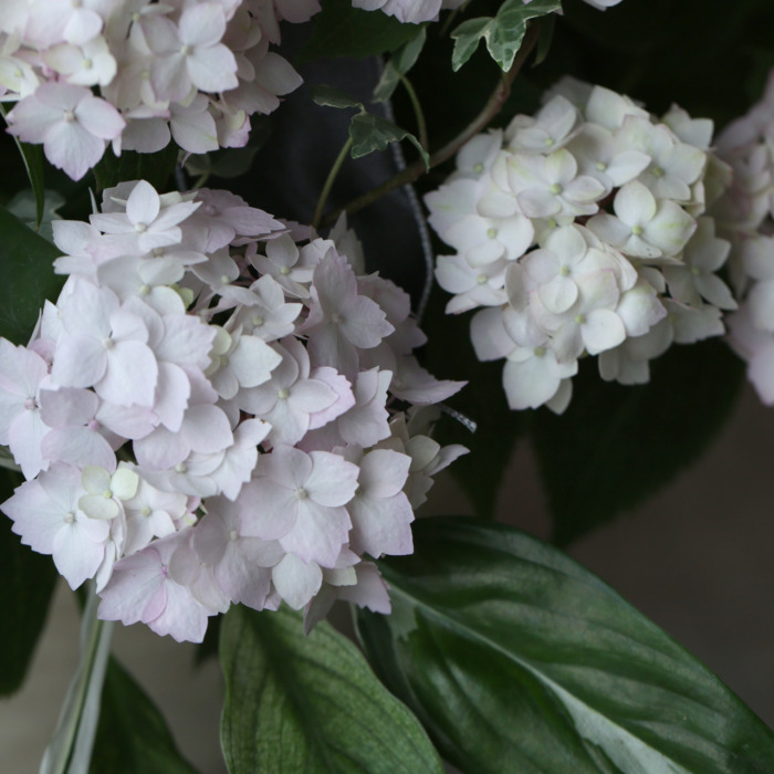 ヤマアジサイ「倉木てまり」、ロングアイビー、斑入りスパティフィラム