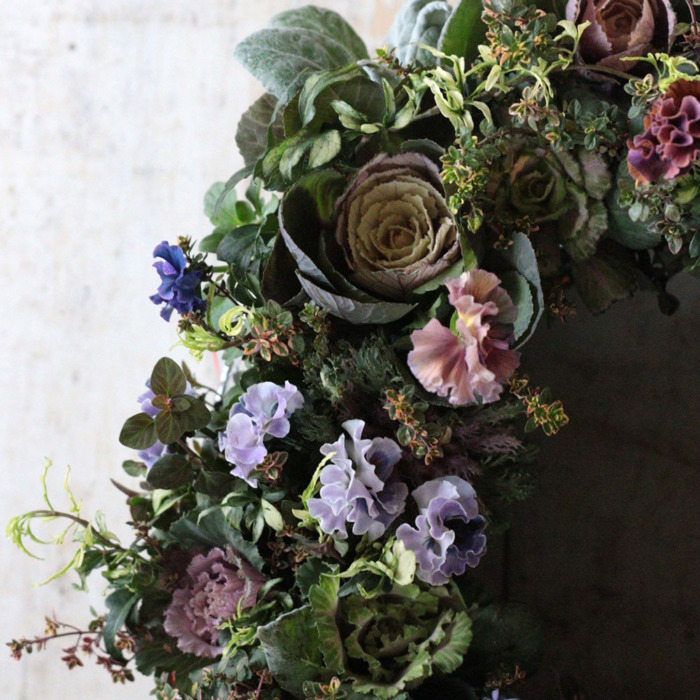 目の前にある花苗達に敬意と色気をまとわせて、贅沢なご褒美リースとして作成しました。
