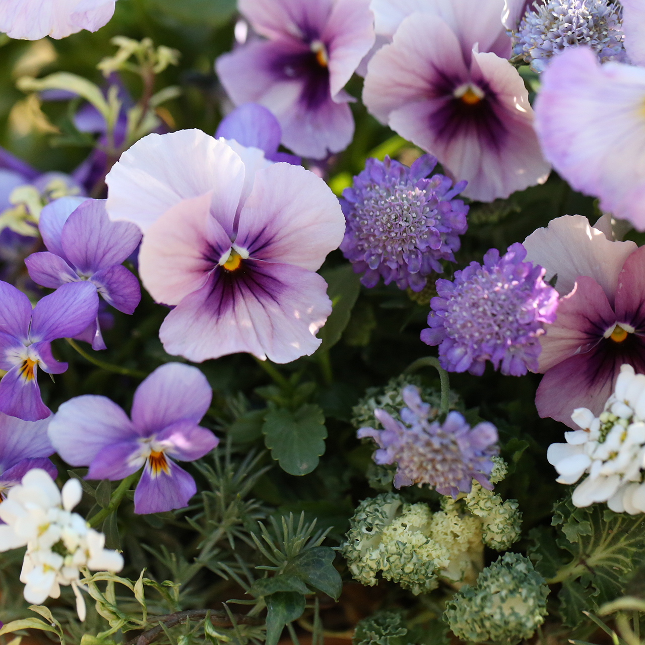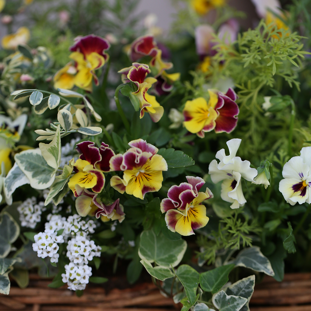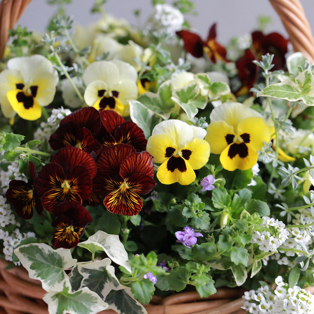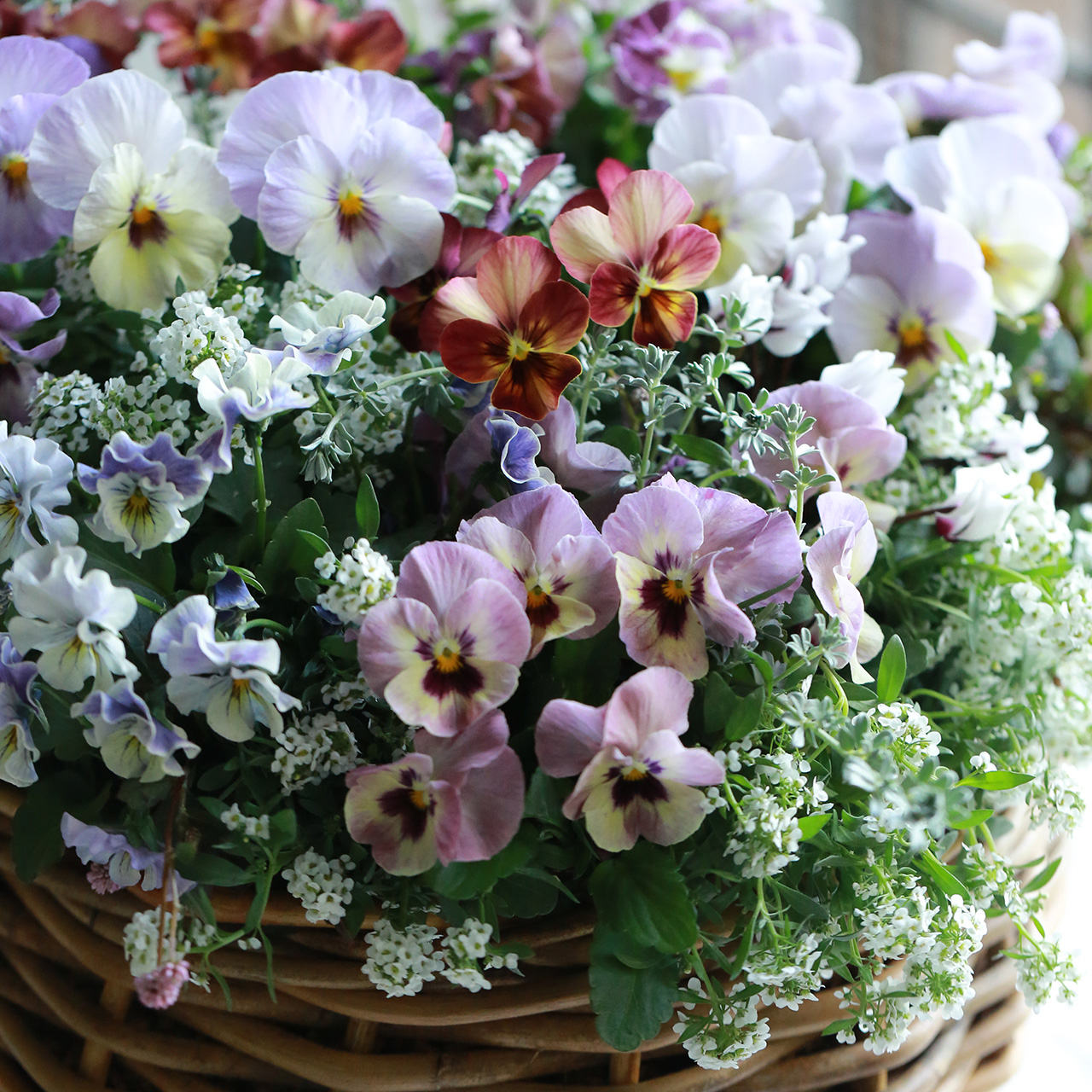 ビオラをふんだんに使って、花カゴのようなブリコラージュフラワーを作ります。