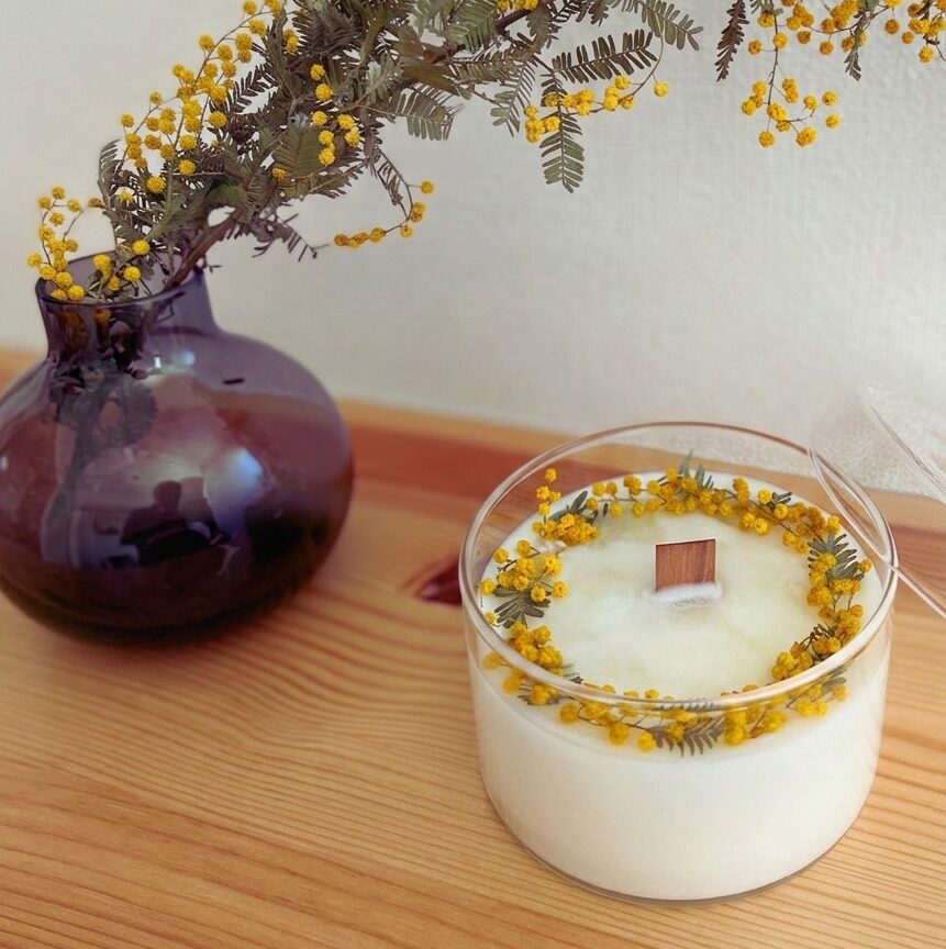 ソイキャンドルに農園のミモザをリースのようにデコレーションしたキャンドル。