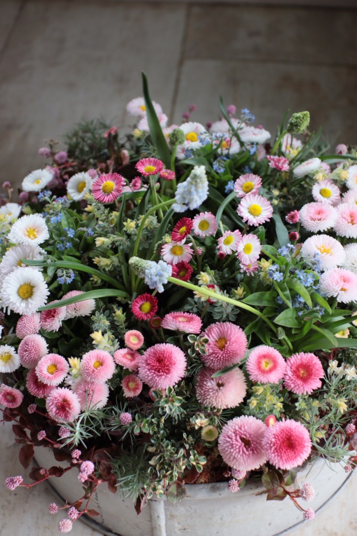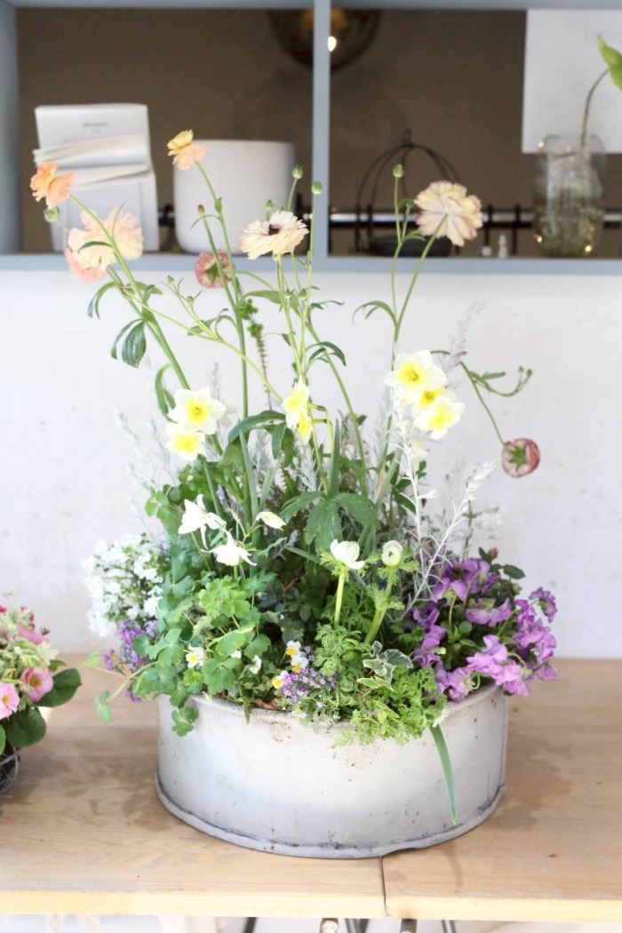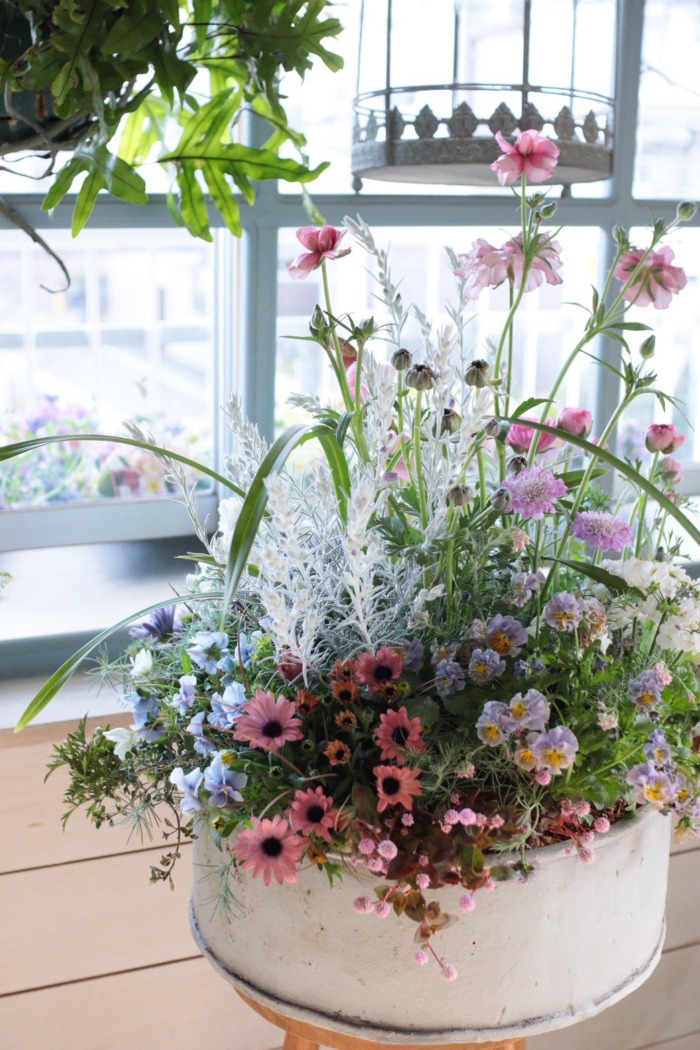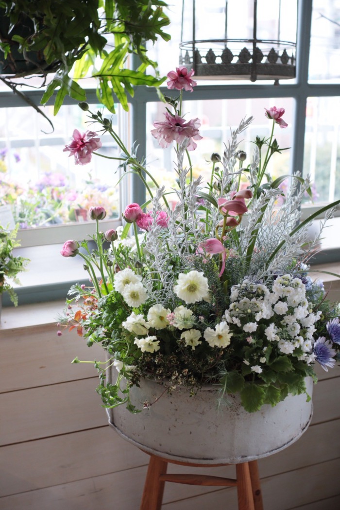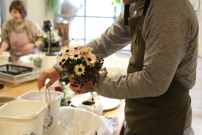 手の中で最大限に可愛い花束ユニットを作り、そのまま器にズボッと差し込み整えるという作業になります。